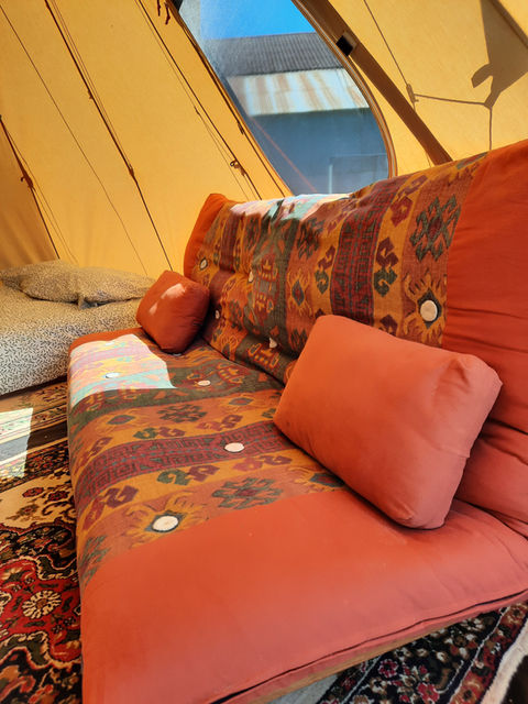 Deze luxe, sfeervolle tent is een garantie tot een heerlijk verblijf . Doordat de tent op zijn hoogste punt 2.50 meter hoog is, geeft dit een fijne stahoogte in de hele tent. Net als alle andere tenten is hij voorzien van alle gemakken. Zo slaap je in deze tent in een bed met echte matrassen, die voorzien zijn van dekbedden en kussens. Daarnaast staat er kastje met allerlei serviesgoed en is de tent voorzien van solarverlichting. Buiten staat er een picknicktafel, twee luxe ligstoelen met tafeltje en hangt er een hangmat stoel in de grote walnotenboom.
